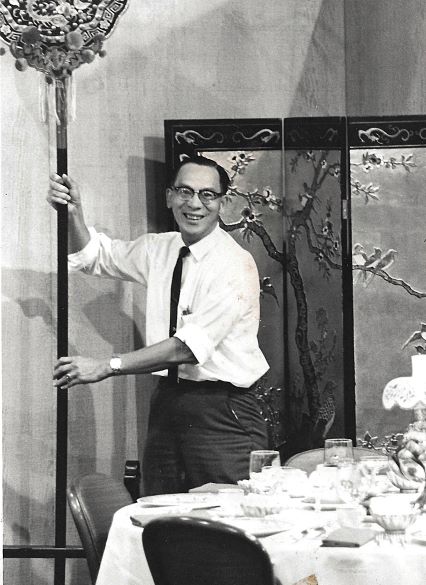 My dad was a consummate marketer. At every opportunity, he promoted the Empress of China through newspaper and magazine articles, radio talk shows, and TV appearances. In 1972, the California State Exposition (CalExpo) included a Chinese heritage show with exhibits of artifacts from the Chinese Historical Society, artwork from Taiwan, and a special table display from the Empress of China. H.K. designed the display in the style of the restaurant’s Emperor’s Chamber, with two dining tables arranged with ornate Chinese tableware. He created a brochure and postcard for the restaurant and a recipe booklet of 20 of the Empress’s famous dishes for Expo visitors. The booklet included recipes such as Empress Egg Roll, Fresh Lemon Duck, and my favorite dessert, Peking Honey Apples.