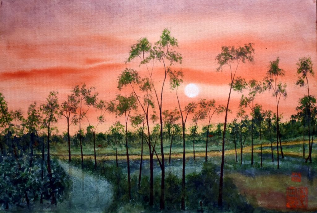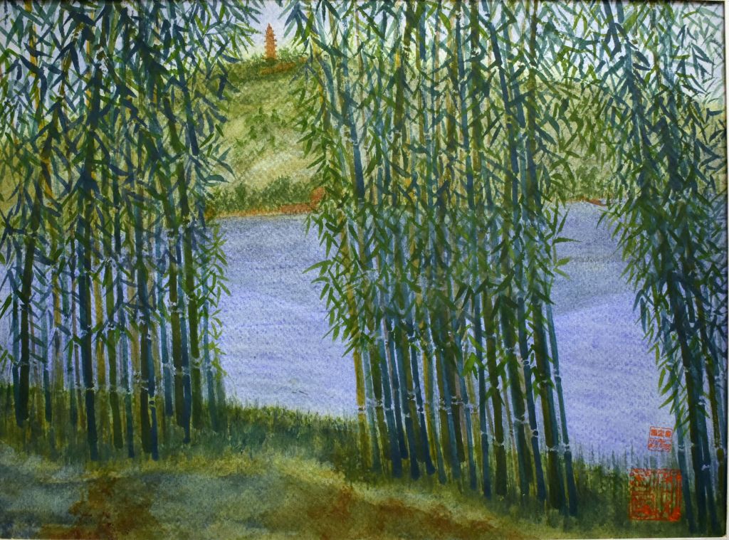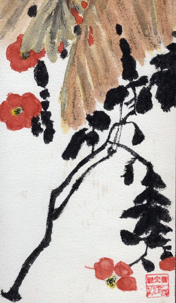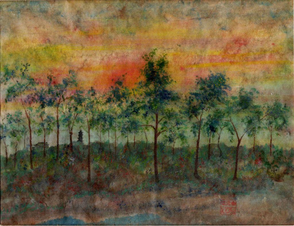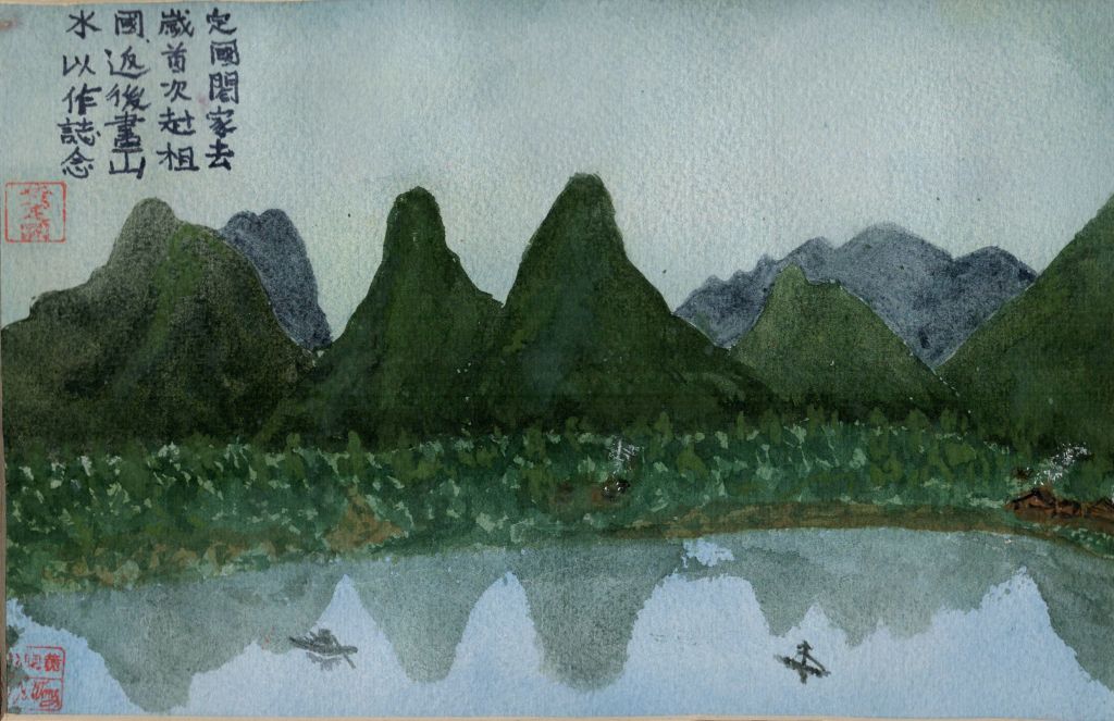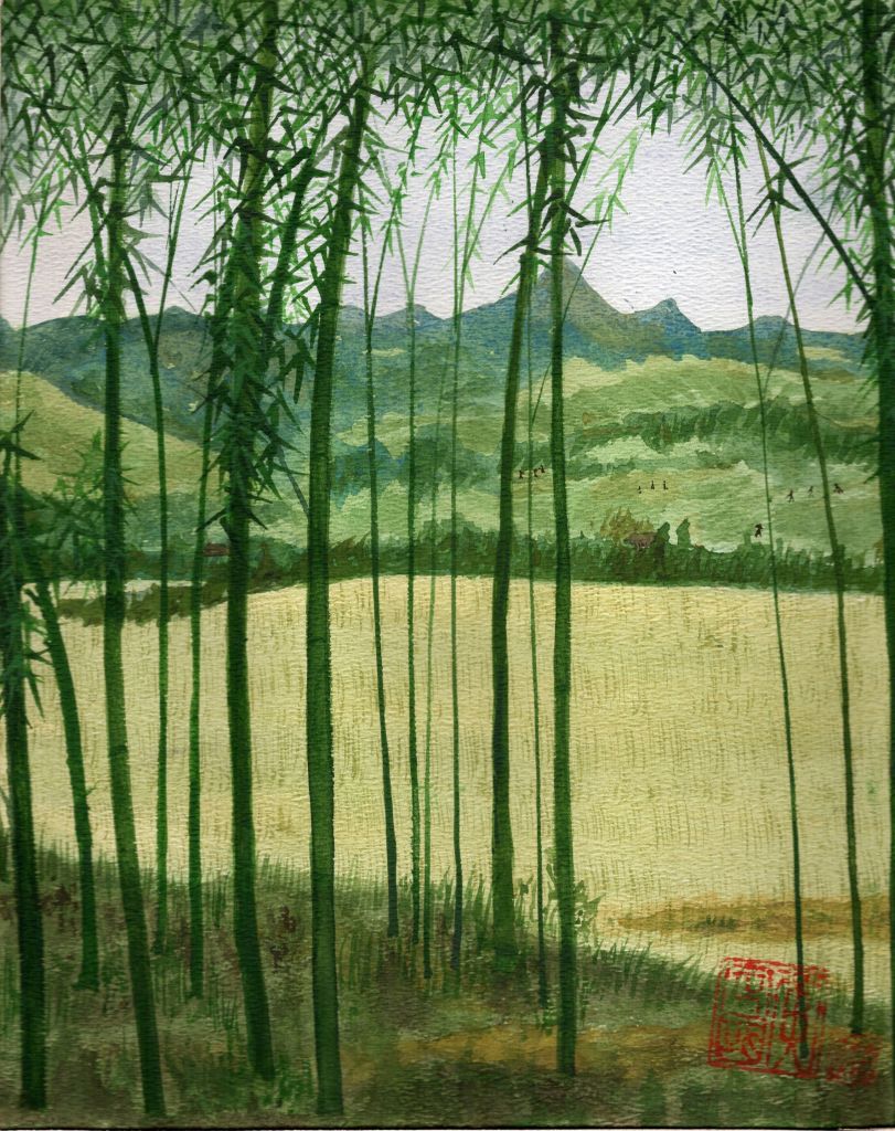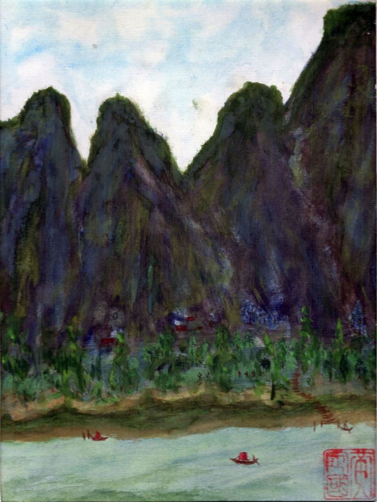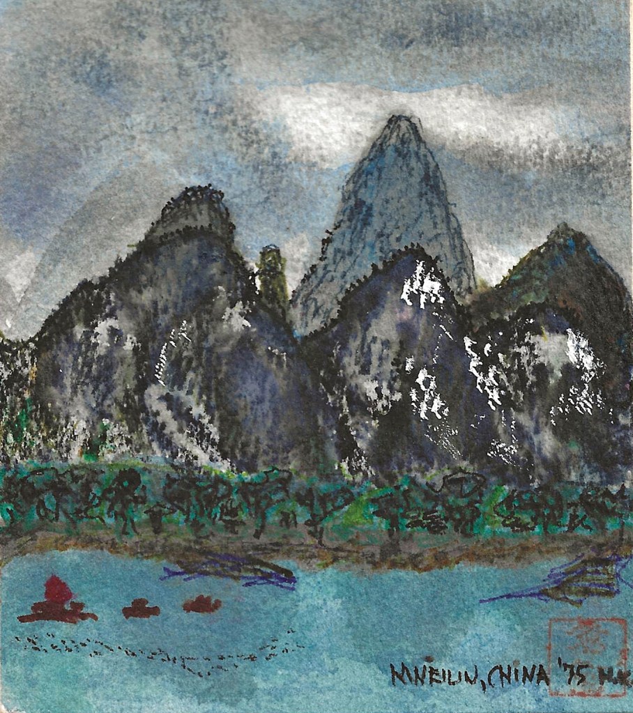 H.K.’s interest in watercolor painting started during our family’s 33-day trip through mainland China in 1975. While visiting the Kweilin Mountains, he became entranced with their beautiful formations. With his felt pen, he created a stack full of sketches of the scenery. My dad’s artistic talent had been evident at an early age in two pencil sketches of farmworkers he drew in grade school. He received high marks for those drawings. My dad liked to doodle on scrap paper or cardboard and make sketches or drawings with a ballpoint pen or felt marker. To get a watercolor effect, he would wet the marker or dab the drawing with water or tea.